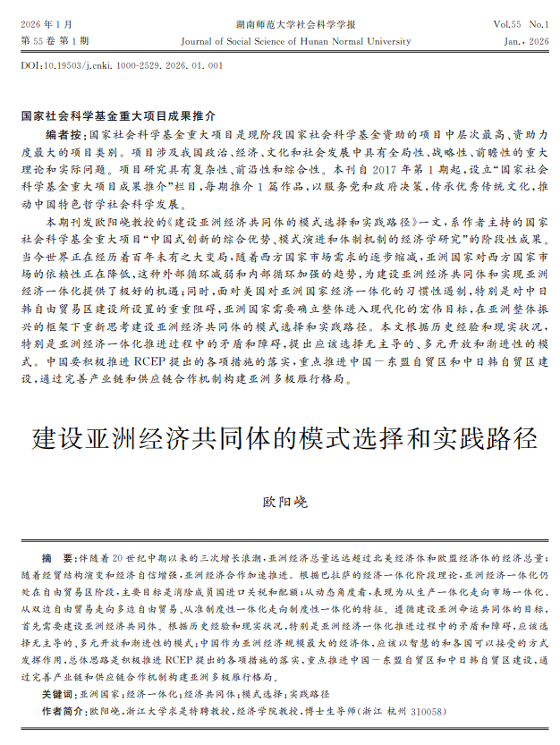 (本网讯)最近出版的《湖南师范大学社会科学学报》杂志2026年第1期刊登了欧阳峣撰写的论文《建设亚洲经济共同体的模式选择和实践路径》。